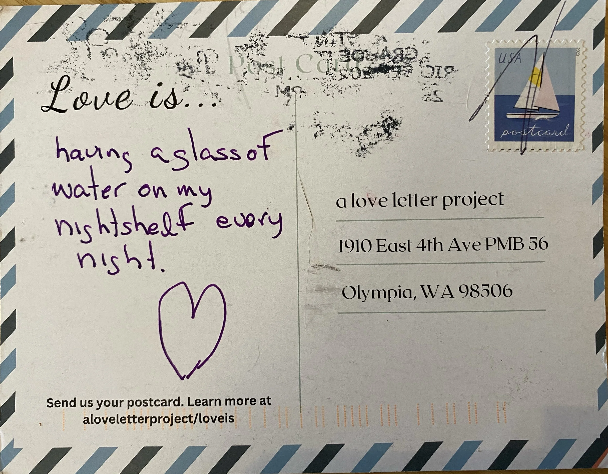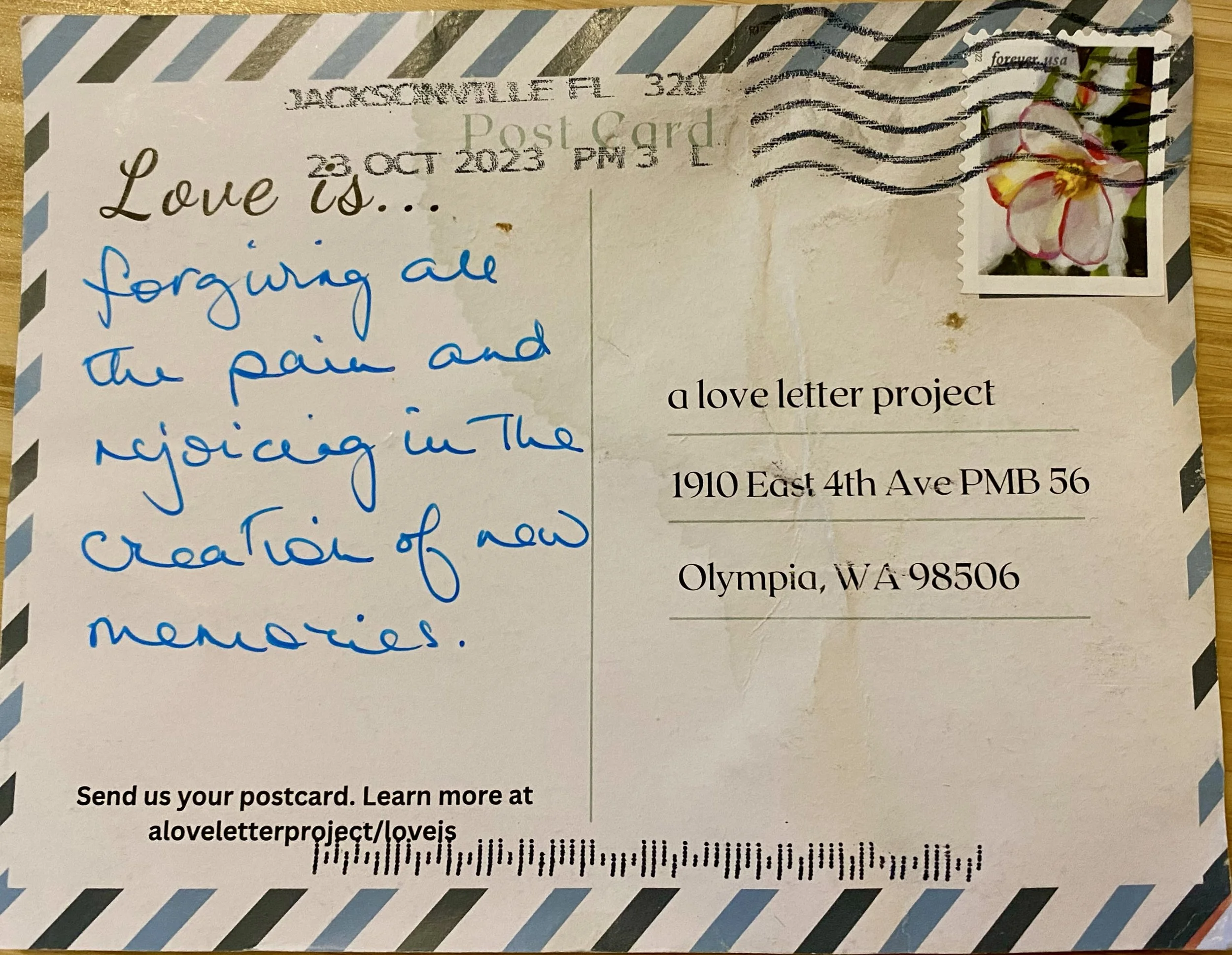 Quick instructions: For consideration in our online gallery, email us an electronic copy of your “Love is…” postcard or mail us a copy of the physical card. You can create your own postcard using art supplies or using a program like Canva. You can also take advantage any of the available postcard apps. We have had fun with Touchnote, MyPostcard, and Postagram.